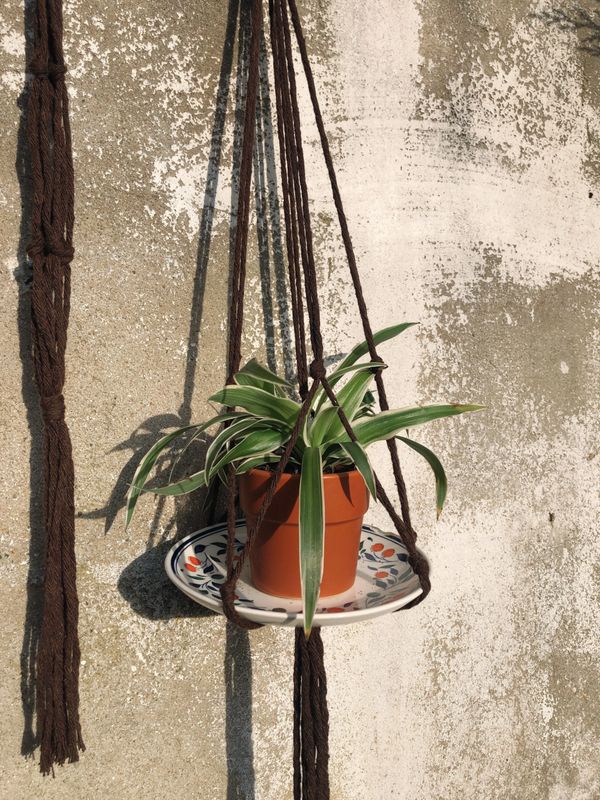 This chocolate plant hanger is made with 95% recycled fibres & knotted onto wooden hoops (with secondary adjustable hook for ceilings).